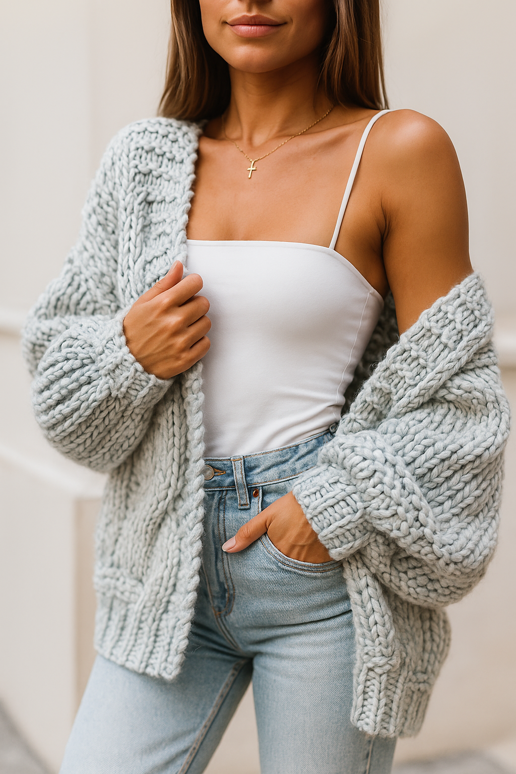 Imagínate ponerte un cárdigan que se siente como un abrazo. Elin™ No es solo una prenda, el calor es una sensación. Un tejido suave y grueso con un corte holgado completa cualquier look, ya sea para estar en casa o para salir.